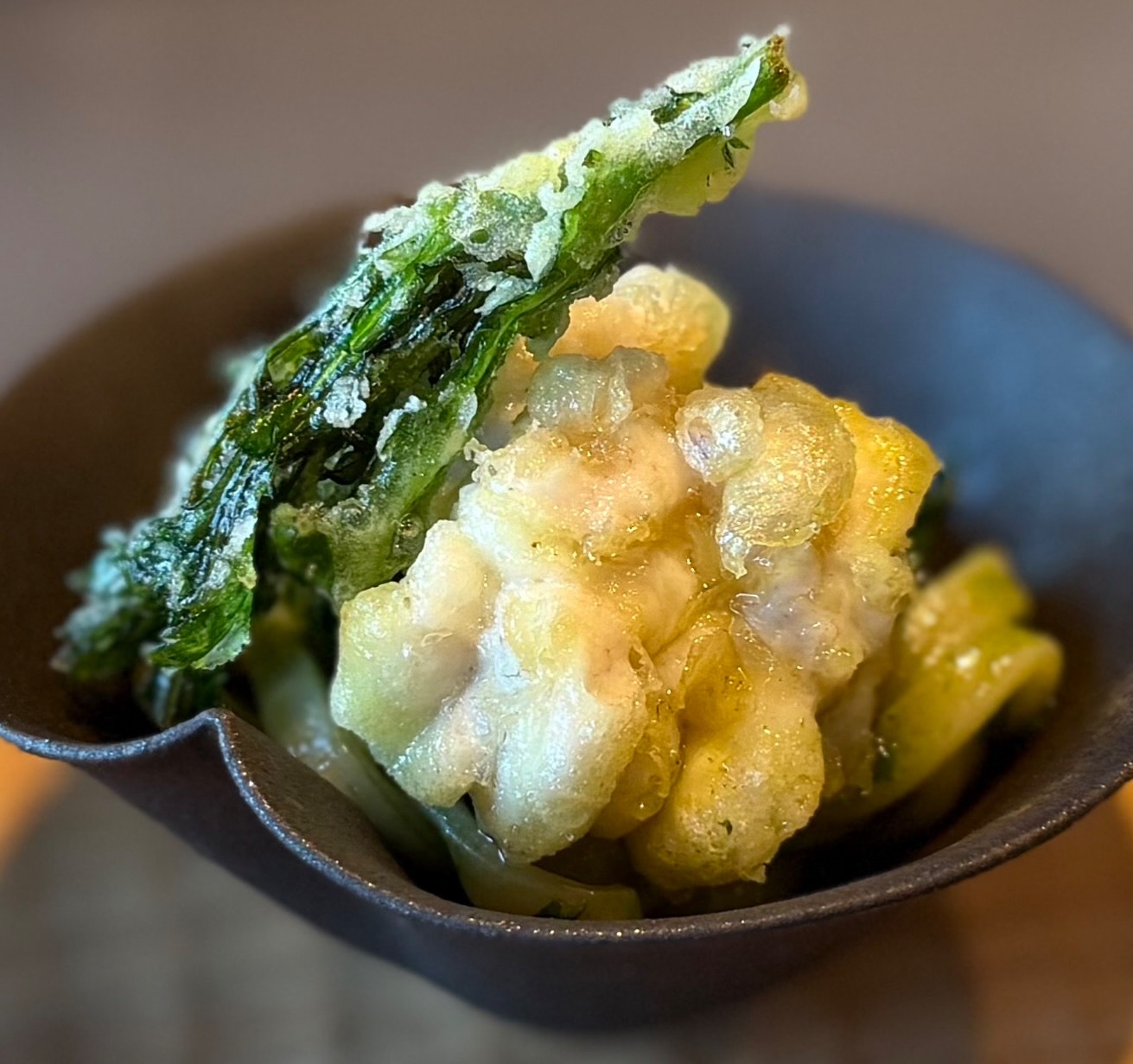 春菊のオイルや天ぷらや湯引きでの重ね合わせはもう究極です!!白子天との洗練されたマリアージュ🥳