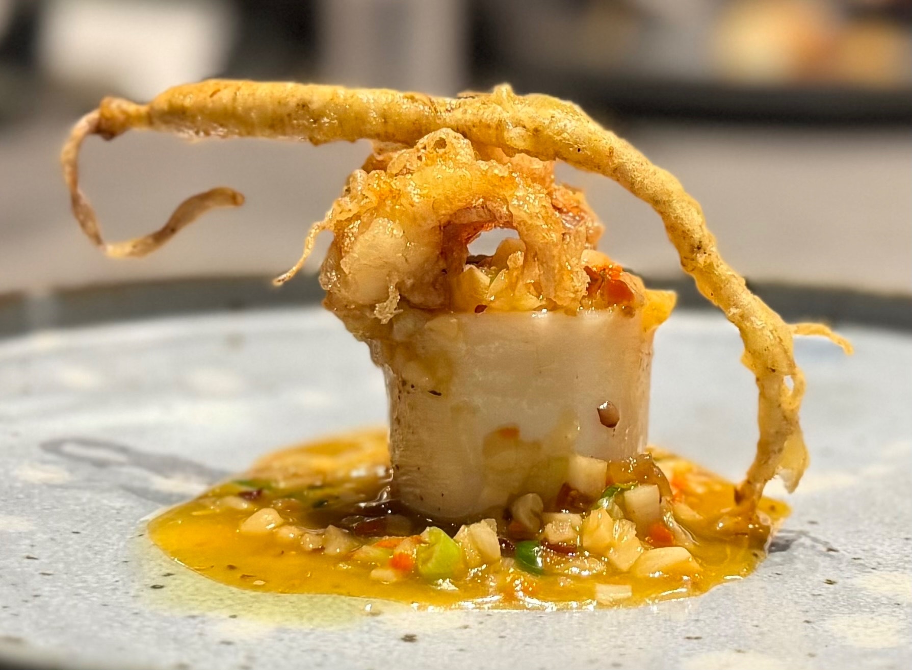 白イカの参鶏湯 ゲソともち米を詰めて 1年ものの高麗人参の天ぷらとカレーパウダー 6年ものの高麗人参の参鶏湯ソース