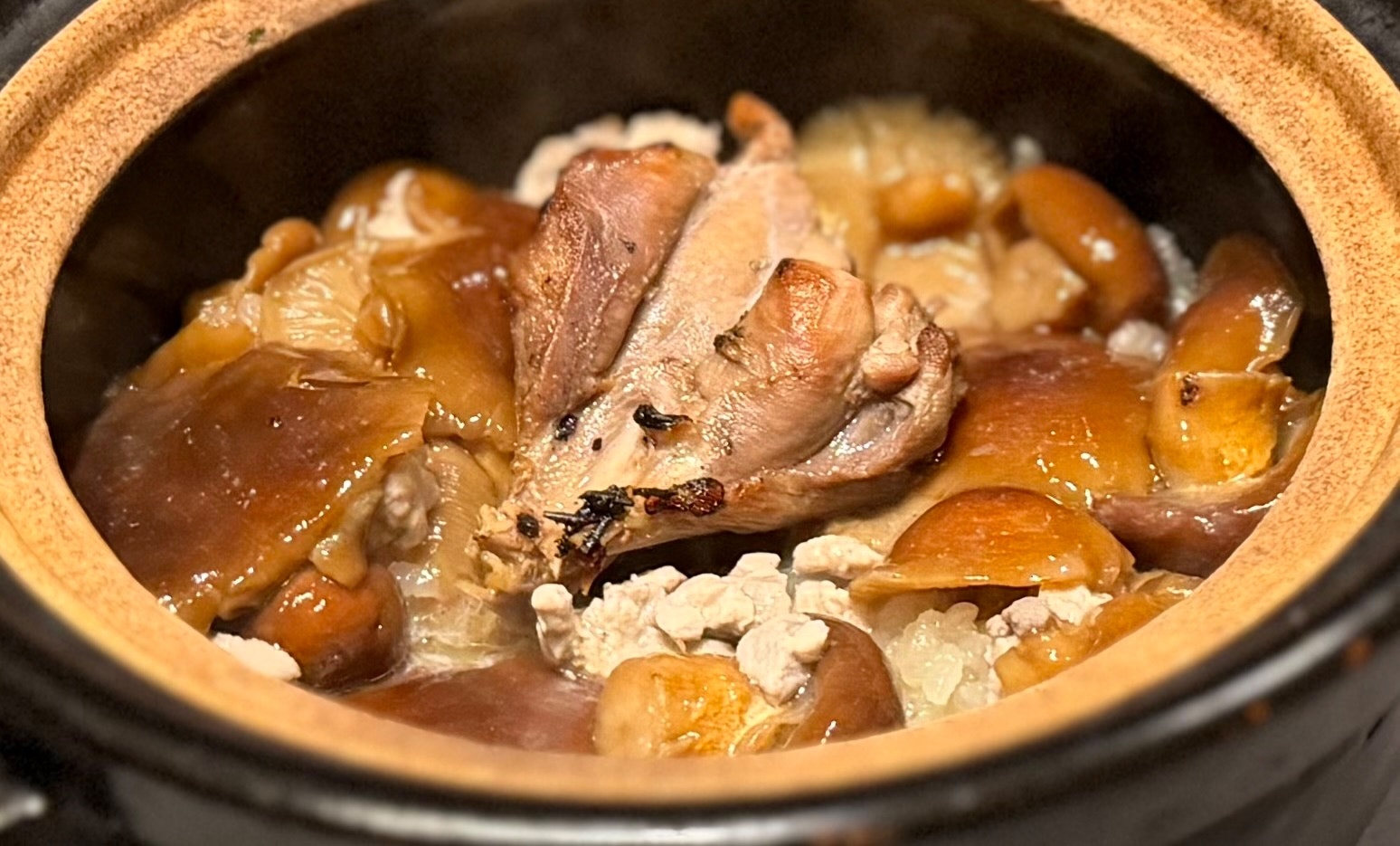 雉のお出汁だくだくのリゾットです🥰天然滑子の巨大さと,ぷりぷりとした触感を究めた雉飯!