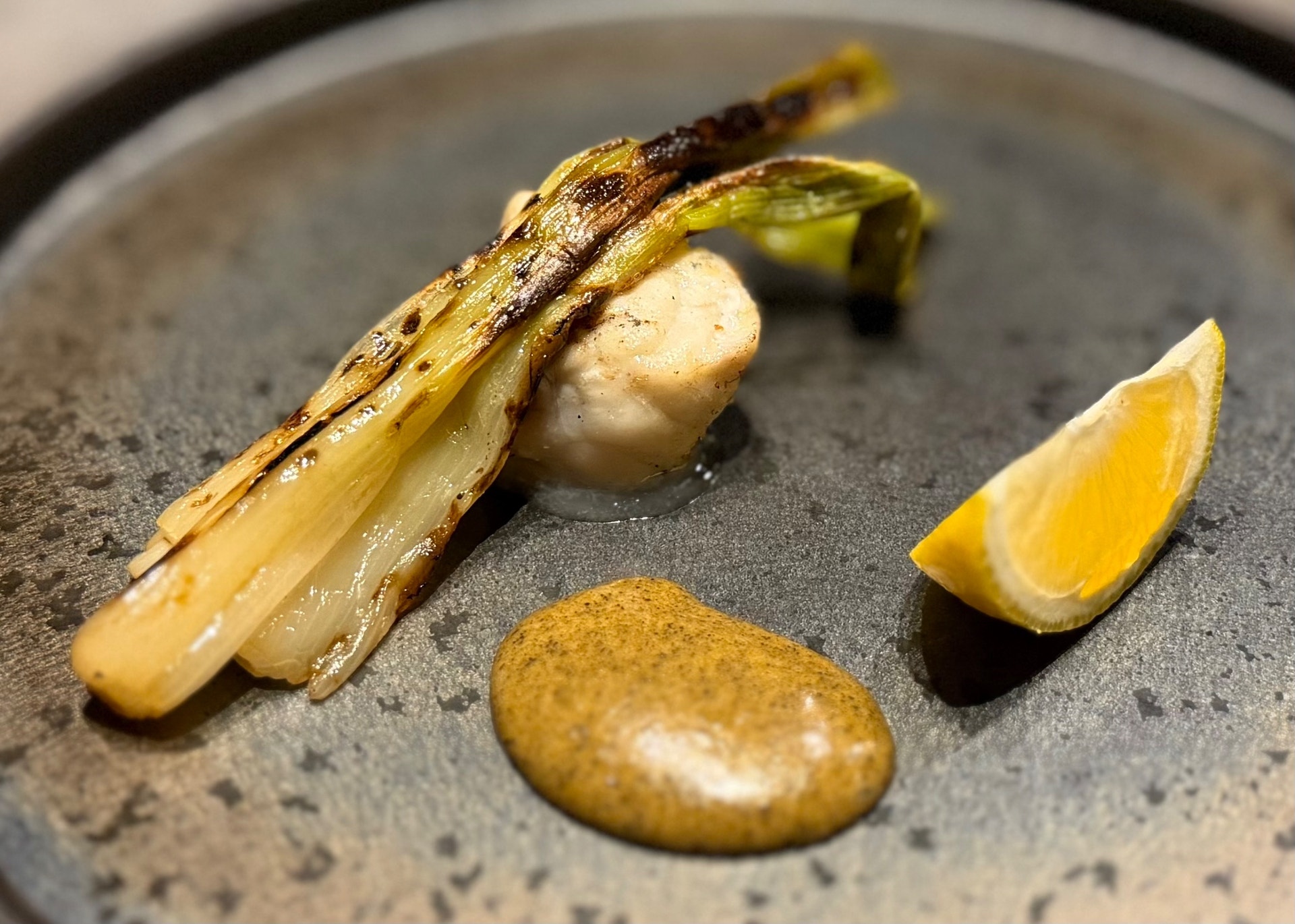 河豚 種なし香母酢 焼き葱のオランデーズソース 河豚骨のスープと鉄皮