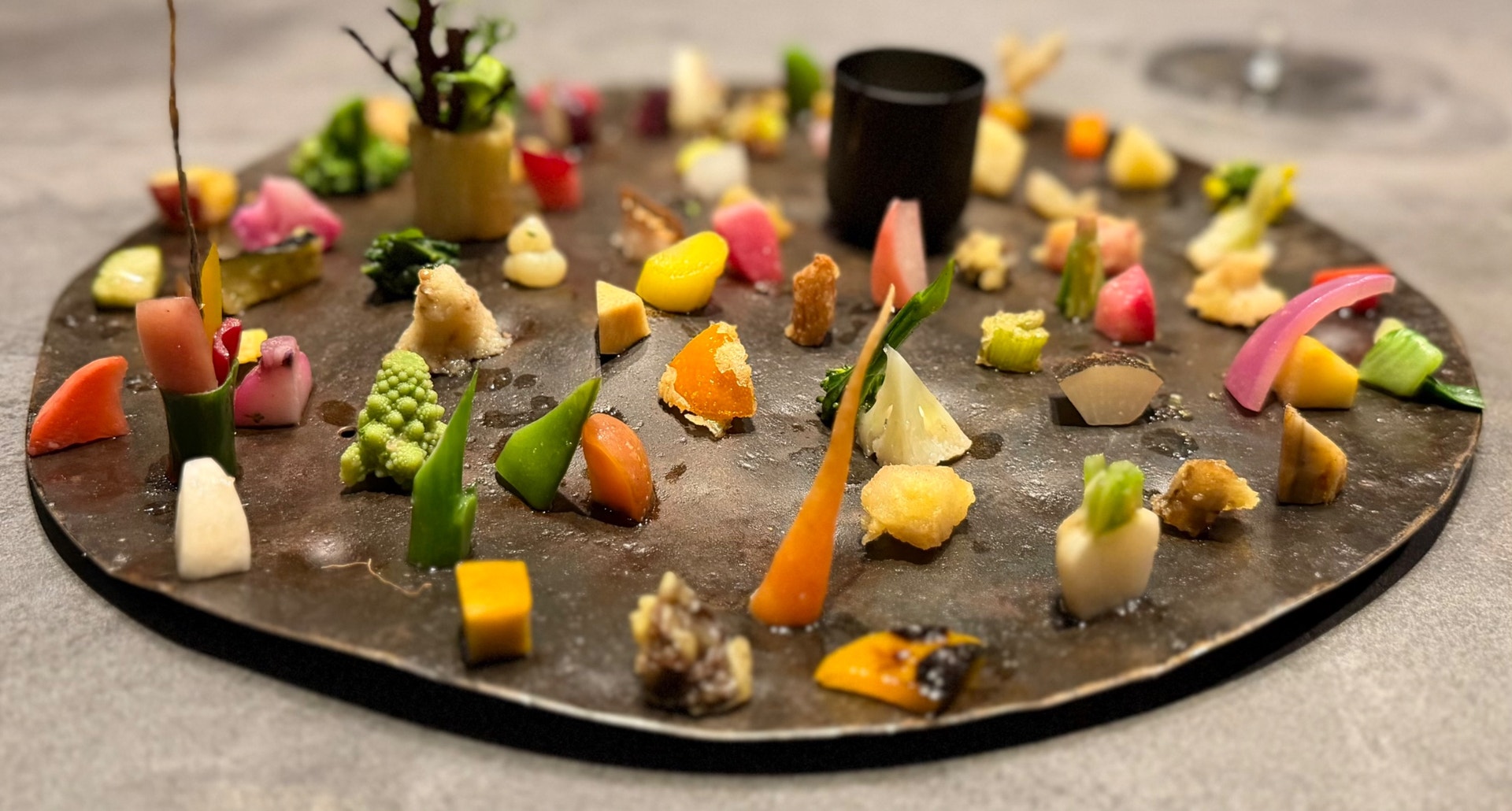 約100種類の野菜を各々最適な調理法で一皿に盛り付けられた,TSUSHIMIのシグネチャーです😌一皿の中に1つの宇宙が閉じ込められてるような,圧巻のマスターピース🌟